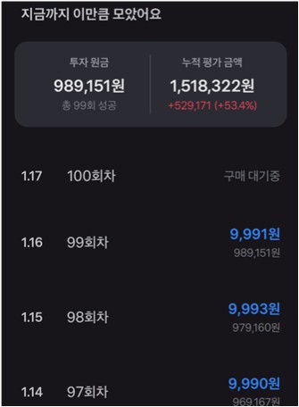 막상 100회 동안 꾸준히 투자하다 보니 어느새 꽤 많은 금액이 모여있었습니다.