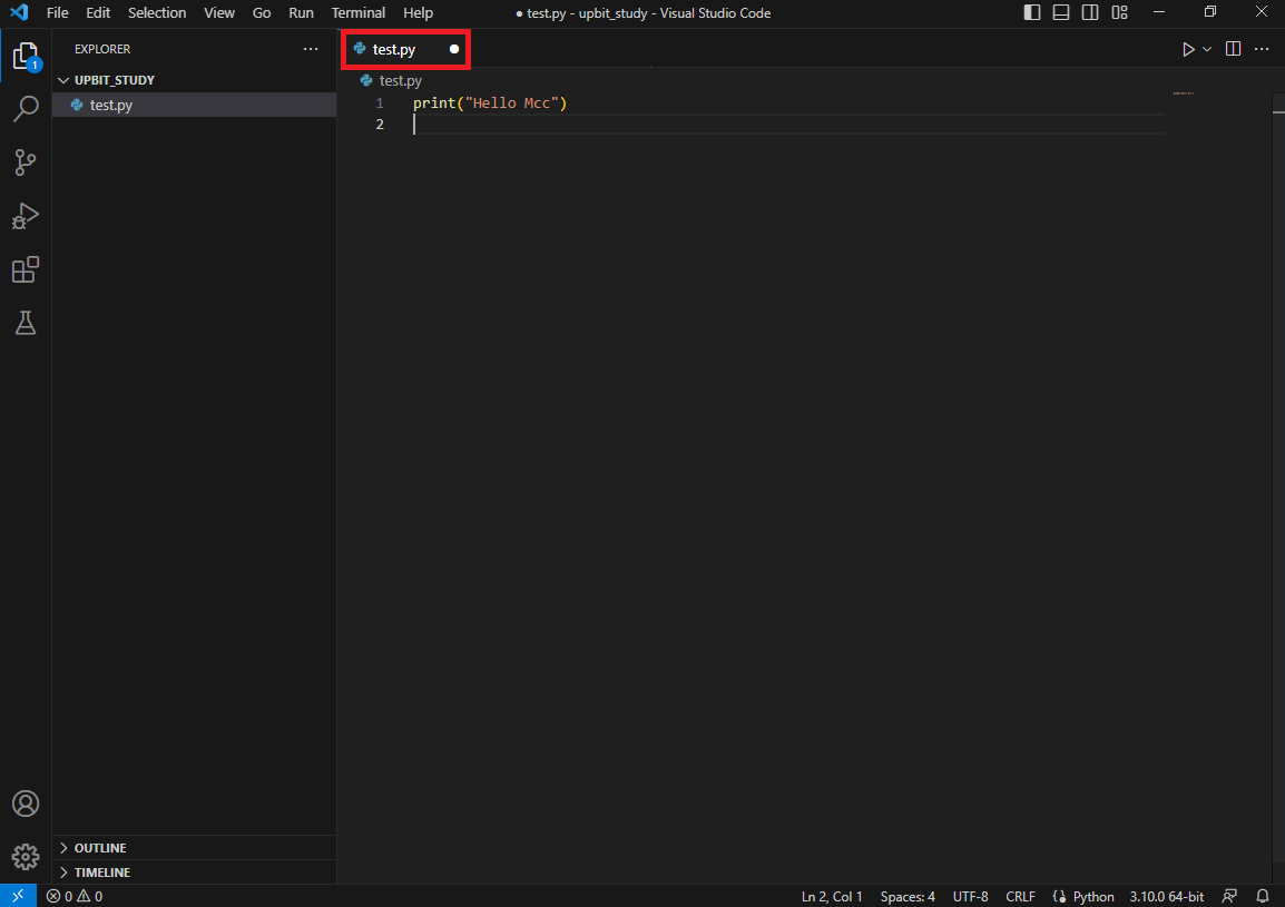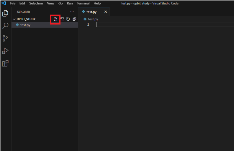 작업공간을 지정한 뒤 파일 생성 버튼을 눌러 test.py 라는 파일을 만들어 주세요.