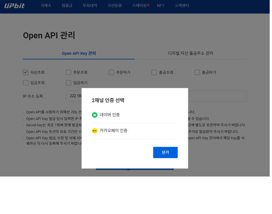 - 필요한 기능과 IP를 입력 후 발급받기를 누르면 네이버/카카오 인증 진행 (편한 방법 선택)
