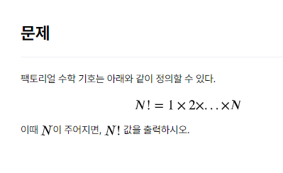 우선 문제는 중학교 쯤(?) 배웠던 팩토리얼을 계산하는 문제네요.