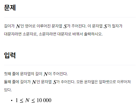 길이가 N인 영문 S를 입력받고, 대문자->소문자 / 소문자->대문자 변경하라는 문제네요.
