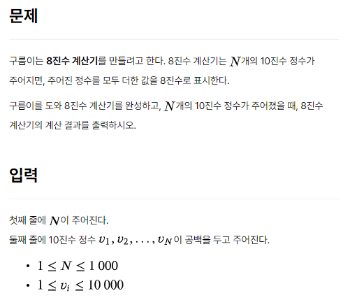 다음으로 입력 받은 정수들을 모두 더한 뒤 8진수로 변환해주면 되겠네요.