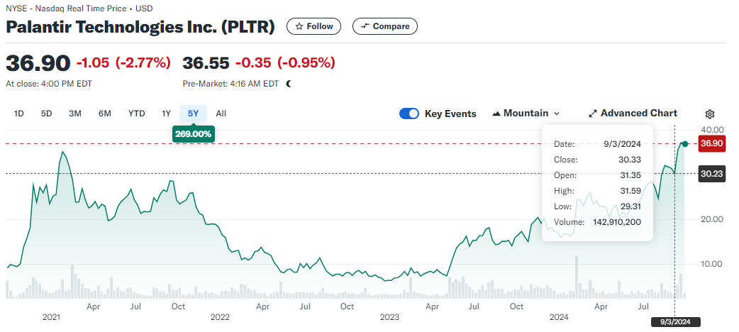 23년도 초부터 주가가 우상향 하기 시작하고, AIP(LLM)의 관심과 함께 팔란티어가 꽤 유명해진 것 같습니다.